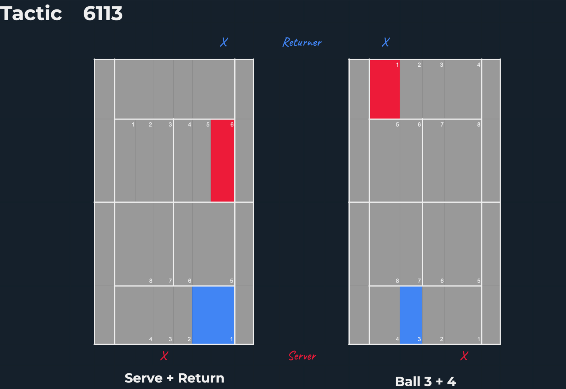 Analysis: This is one of the openings we see in the Federer video. Maybe the server lands a well hit serve and the returner makes contact a little late or maybe they go line on purpose, either way - once the returner goes line off of this return, its a green light for the server to drive their forehand deep cross court. This spreads the court with the serve and the +1 and is a very strong way to start a point. Learning to run this opening with confidence, power, and margin as a server will come in clutch in a lot of matches.